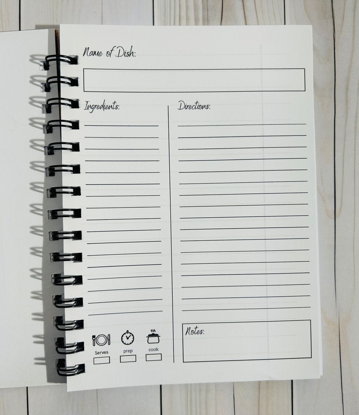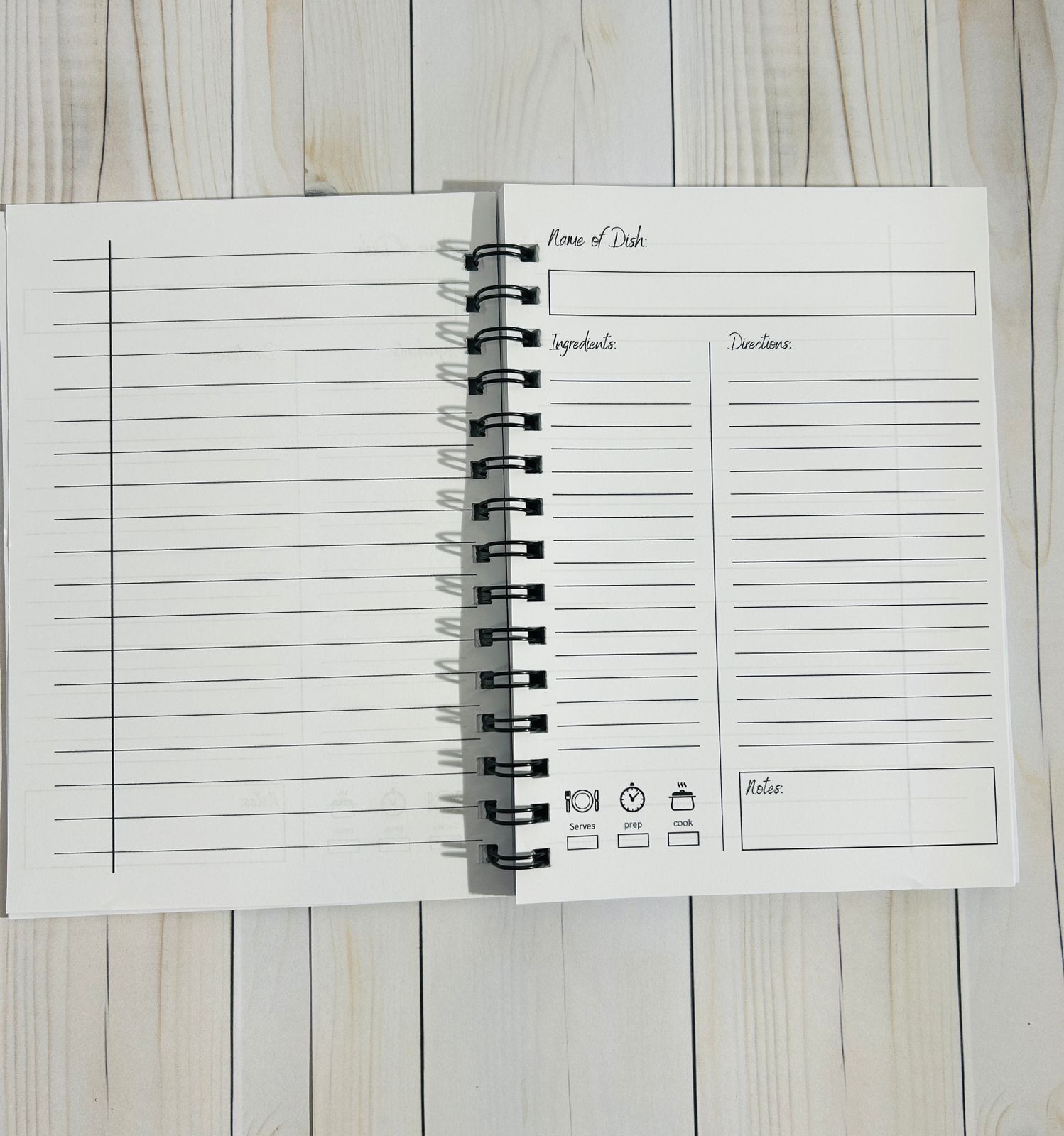 Each recipe page has space for ingredients, method, and notes